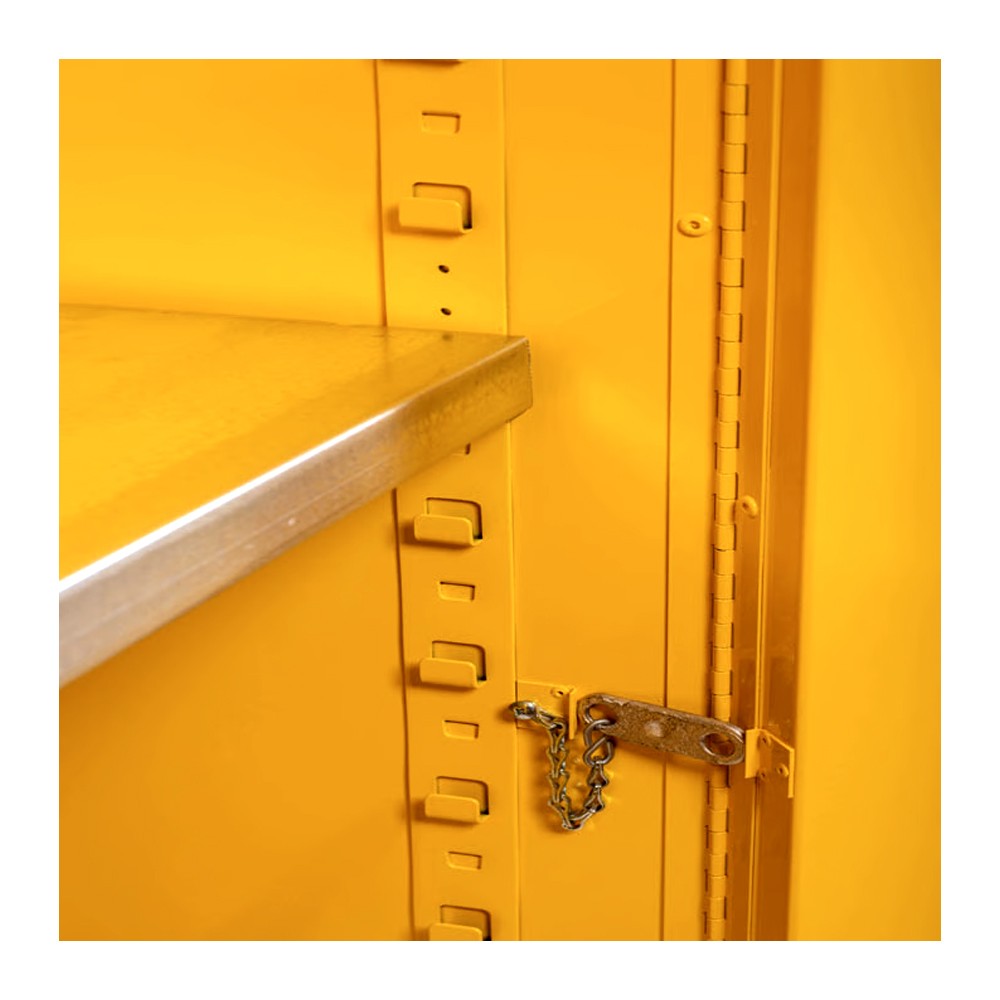 Eşsiz SpillSlope™ galvanizli çelik raflar dökülmeleri arkadan ve tabandan sızıntı haznesine yönlendirir. Çok amaçlı depolamada 76 mmlik merkezlerden ayarlanabilir. Diğer ekstralar sızıntı geçirmez 51 mm alt karter, alev tutucularla çift yönlü havalandırma, ayarlanabilir kendiliğinden yükseltilebilir ayaklar, topraklama bağlantısı ve 3 dilde uyarıcı etiketler.