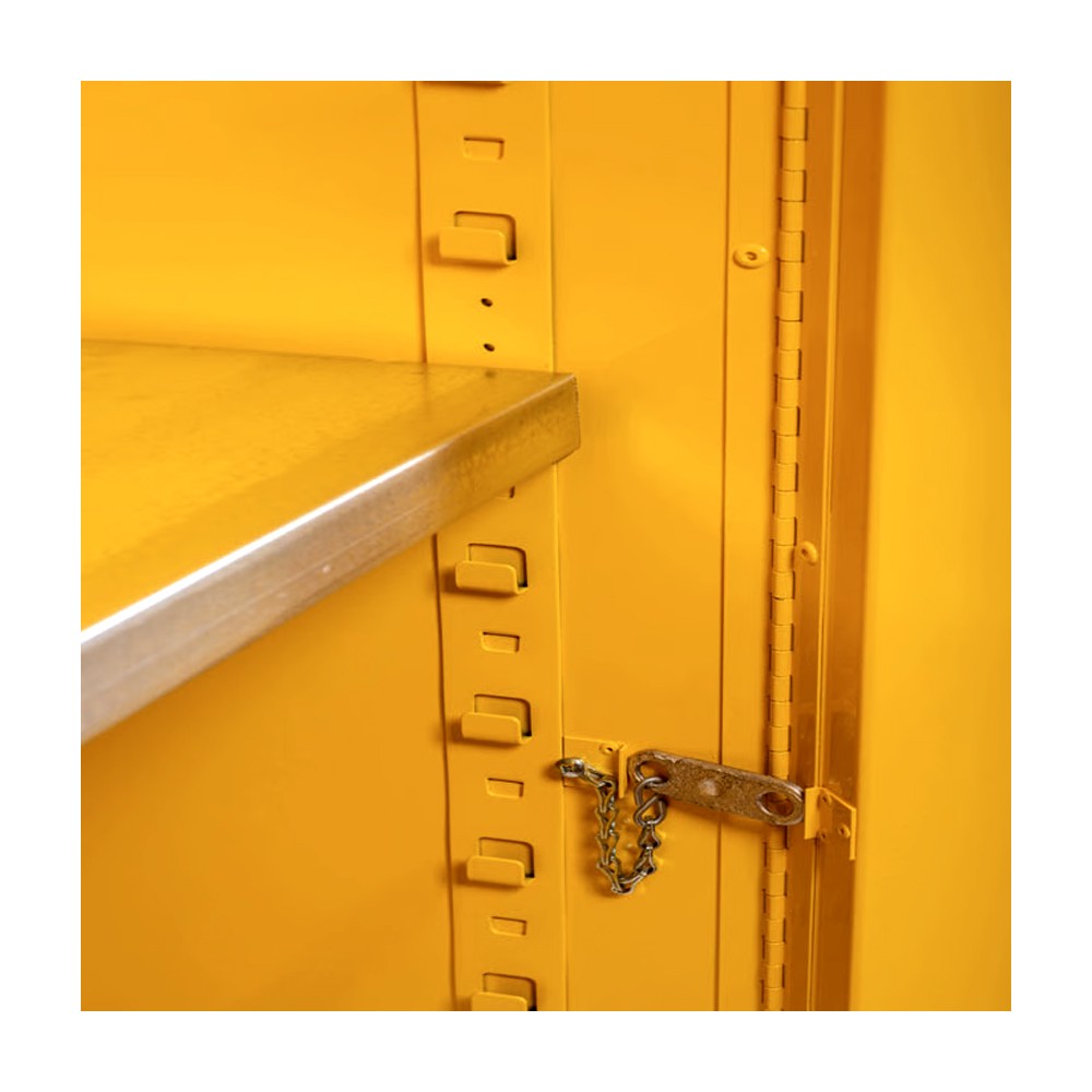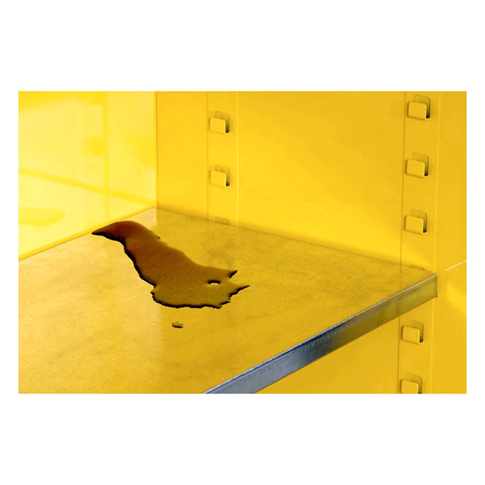 Eşsiz SpillSlope™ galvanizli çelik raflar dökülmeleri arkadan ve tabandan sızıntı haznesine yönlendirir. Çok amaçlı depolamada 76 mmlik merkezlerden ayarlanabilir. Diğer ekstralar sızıntı geçirmez 51 mm alt karter, alev tutucularla çift yönlü havalandırma, ayarlanabilir kendiliğinden yükseltilebilir ayaklar, topraklama bağlantısı ve 3 dilde uyarıcı etiketler.